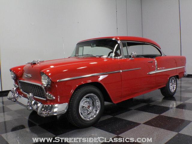 Few cars are more versatile than the shoebox Chevys, and as this brilliant red 1955 Bel Air hardtop proves, they can be fast as well as comfortable with a style thats recognized around the world. The styling was so perfect in 1955, the best customs dont try to change much. This car retains all its original trim, which on the Bel Air models was considerable. The bright red paint is definitely a product of 21st century technology, delivering a shine that even the finest cars in 1955 couldnt match. You can see from the photos that the panels are super straight, and judging from the undercarriage, this has never been a rusty car. Add in restored brightwork and trim, and this is a seriously nice car. Inside, the custom interior replaces sticky 50s vinyl with luxurious gray fabric that was stitched together in a period-appropriate pattern. Those are the original seats, but with fresh foam underneath theyre all-day comfortable. Matching door panels with embroidered Belair stitching continue the vintage vibe, and thick carpets give the interior an upscale feel and help control noise and heat. The original dash has been restored and painted to match the body, with beautiful bright trim that looks like a million bucks. A column-mounted tach is a traditional racers touch that looks right at home in the Bel Air, as does the Hurst shifter for the 4-speed underneath. Like the bodywork, other than the late-model Chevrolet steering wheel and the AM-FM-cassette stereo in the dash, the builder let the original design do most of the talking. The result is a fabulous passenger compartment that shows well and wears like iron. The biggest engine you could get in 1955 was a 265 cubic inch V8, but under the hood of this Bel Air today lives a rumbling 454 cubic inch big block. Looking very OEM with its bright Chevy Orange paint, its a neat fit in the Bel Airs engine bay with no cutting or modifications needed. A few chrome bits dress the place up, including Edelbrock valve covers and air filter, the master cylinder lid, and the accessory brackets. Fuel delivery is thanks to a Holley 4-barrel, and the exhaust is managed by a set of ceramic-coated long tube headers dumping into a relatively quiet dual exhaust system. Underneath theres a 4-speed manual spinning the original rear full of 3.08 gears, power disc brakes, and air shocks out back. The entire undercarriage is solid with no signs of structural damage or rust, although it hasnt been detailed for show. This 55 Chevy will never go out of style. With enough power to be entertaining on the street, and enough comfort to be able to drive cross-country, its an ideal combination of vintage looks and modern performance. Call today! This vehicle is located in our Atlanta showroom. For more information, please call (678) 279-1609 or toll free (877) 367-1835.